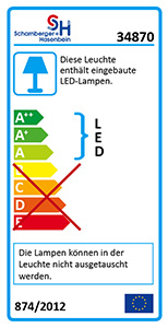 Gekennzeichnet nach Nr. 3b, Verordnung 874/2012, Anhang I (2), Diese Leuchte enthält fest eingebaute LED-Lampen., Quecksilbergehalt (mg): 0, Schaltzyklen: >25000, Zündzeit/Startzeit (s): 0,0, Lichtstromerhalt: 0.70, SDCM: <7