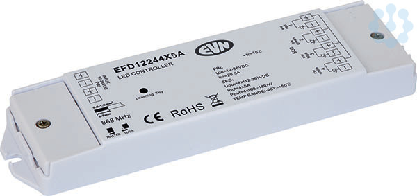 Der LED-Multicolor-Empfänger kann fuer Unicolor-, Tunable-White-, RGB-, und RGBW-Leuchten verwendet werden. Geeignet fuer Leuchten mit einer Betriebsspannung von 12, 24 und 36V/DC. Die tatsächlich zu verwendende Eingangsspannung ist abhängig von der benötigten Spannung der angeschlossenen Leuchten. 1x Eingang, so wie 1x Ausgang fuer 12-36V/DC und 4x Ausgang (RGBW). Die Schraubklemmen sind fuer Kabel von 0,5mm². - 1,5mm². geeignet. Technische Daten: ta: -20°.C - 50°.C, tc: 75°.C, max. Ausgangsleistung je Kanal: 5A. 60W bei 12V/DC, 120W bei 24V/DC und 180W bei 36V/DC. Die Ansteuerung erfolgt ueber Funk-Sender mit 868MHz. Um auch größere Anlagen problemlos umsetzen zu können, können mehrere Controller als Master-Slave-Anwendung synchron gesteuert werden.
