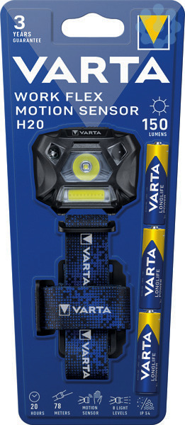 Kopfleuchte mit Bewegungssensor für freihändiges Arbeiten und 2 Leuchtstufen (Spot- und Flutlicht). Spritzwasser- und staubgeschützt (IP54). Kopfband mit Mittelband für einen optimalen Sitz. Zum Aktivieren der Bewegungssensor-Funktion die Ein- / Aus-Taste 3 Sekunden lang gedrückt halten. Im Bewegungssensormodus mit der Hand winken, um das Licht ein- oder auszuschalten. Die Leuchtstufen lassen sich in 8 Modi differenzieren: Spotlicht (High, Low, Stroboskop, SOS), Flutlicht (High, Low), Spotlicht mit Bewegungssensor, Flutlicht mit Bewegungssensor. Verstellbares und waschbares Kopfband mit Mittelband.