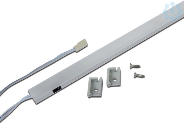 Schrankinnenleuchte mit berührungslosem IR Sensorschalter, Anschlussleitung 2,5m mit LED 24-Stecker, Lichtfarbe neutral weiß ca.4000K, Montageclip zur seitlichen Befestigung bei Auszügen und 500mm selbstklebender Kabelkanal beiliegend