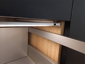 Schrankinnenleuchte mit berührungslosem IR Sensorschalter, Anschlussleitung 2,5m mit LED 24-Stecker, Lichtfarbe neutral weiß ca.4000K, Montageclip zur seitlichen Befestigung bei Auszügen und 500mm selbstklebender Kabelkanal beiliegend