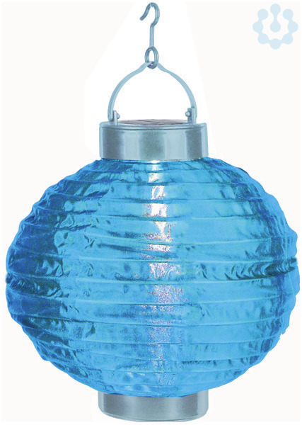 LED-Solarlampion, in blau, inklusive Batterie und Solarpanel, für den Außenbereich. Höhe ohne Henkel: ca. 22cm, Durchmesser: ca. 20cm, Leuchtdauer: ca. 6 Stunden. Ein-Ausschalter an der Unterseite des Solarmoduls, inkl. Akku: 1xAAA Ni-MH 1,2V 600mAh. Das Solarmodul wird Tagsüber durch Sonneneinstrahlung geladen. Bei Dunkelheit fängt die weiße LED dank eingearbeiteter Fotozelle von selbst an zu leuchten. Die Lampions dienen als dekorative Partybeleuchtung, sie können aufgrund ihrer Leistung nicht als volle Beleuchtung eingesetzt werden. Energieeffizienzklasse: nicht kennzeichnungspflichtig