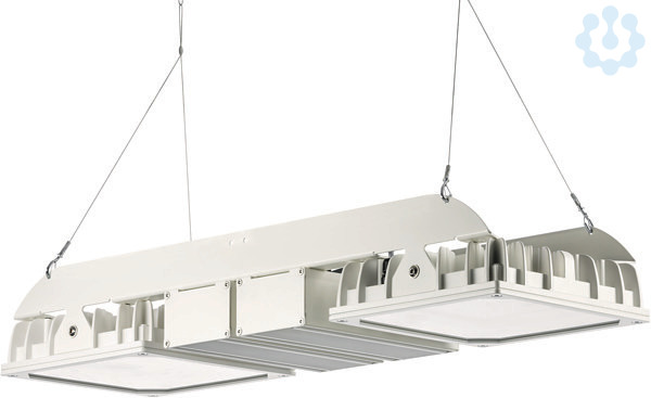 LED Strahler mit Abdeckscheibe aus Einscheibensicherheitsglas (ESG), optimiert für Umgebungstemperaturen bis +70°C. Gehäuse aus Aluminiumdruckguss, weiß beschichtet. Konverter im Leuchtengehäuse integriert. Elektrischer Anschluss durch Schnell-Steck-System, kurze, alterungsbeständige Dichtungen aus Silikon, Zweipunkt-Befestigung durch Seilpendel (2.000 mm) mit montagefreundlicher, werkzeugloser Schnelljustierung.