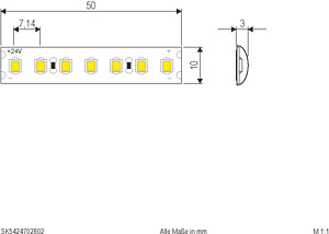 Der LED-Strip kann in jeder Wunschlänge (Angabe in Meter), bis maximal 10m, unter Beachtung des Teilungsmaßes von 50mm konfektioniert werden. Die maximale Einspeiselänge bei einseitiger Einspeisung beträgt 5m. Der konfektionierte Strip wird standardmäßig einseitig mit einer 0,5m langen Anschlussleitung (Kabelquerschnitt: 0,3mm².) ausgeliefert. Wichtig: Um ein Überhitzen des Strips zu vermeiden, darf dieser nur auf wärmeleitenden Untergruenden verbaut werden, vorzugsweise auf bzw. in Aluminiumprofilen. Die Lichtausbeute beträgt 1486lm pro Meter.