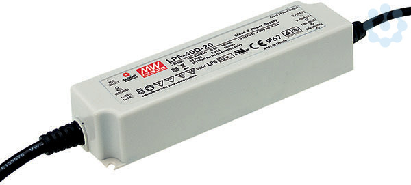 Netzteil/ Transformator - In: 90~305VAC Out: 24VDC. Eigenschaften: Universaleingang, Überlastschutz durch Strombegrenzung, auto recovery, geschützt gegen Kurzschluss, Überlast, Überspannung, eingebauter PFC-Schaltkreis, IP67, für Innen- und Außenanwendungen, für LED- und Beleuchtungsanwendungen, UL1310 Class 2, fixierte Ausgangsspannung, Konstantstrom, EN61000-3-2, Class C, EN55015, EN61347-1, EN61347-2-13.