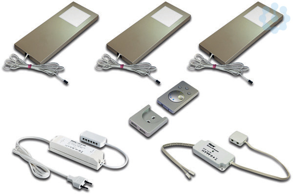 Quadratische, flache LED-Unterbauleuchte mit homogenem Flächenlicht als 3er Set, Anschlussleitung 2,4m mit Dynamic-Stecker, Lichtfarbe einstellbar zwischen ca. 2700K und 5000K, Steuerung über Funk-Fernbedienung