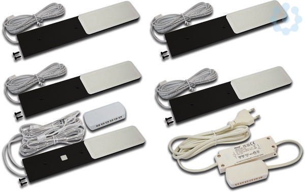 LED-Unterbauleuchte mit homogenem Flächenlicht als 5er Set, Gehäuse Metall, Anschlussleitung 2,5m mit LED 24-Stecker, inkl. steckerfertigem Trafo, Lichtfarbe neutral weiß ca. 4000K, inkl. Touch-Dimmer