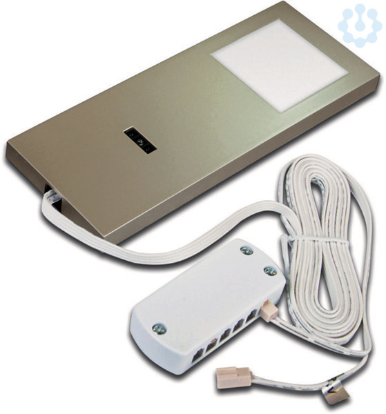 Quadratische, flache LED-Unterbauleuchte mit homogenem Flächenlicht, Gehäuse Kunststoff, Anschlussleitung 2,4m mit LED 24-Stecker, Lichtfarbe warm weiß ca.3000K, incl. berührungsloser IR-Schalter mit NightLight Funktion (zusätzliche kleine LED zur Orientierung im Raum am IR-Schalter) optionales Zubehör: dimmbarer Trafo mit Funkfernbedienung oder 1-10V Dimmer