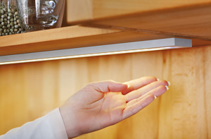 Flache LED-Unterbauleuchte mit homogenem Flächenlicht, Gehäuse Alu, Anschlussleitung 2,5m mit LED 24-Stecker und Leitungsaustritt nach hinten, Lichtfarbe neutral weiß ca.4000K, incl. berührungsloser IR-Schalter mit NightLight Funktion (zusätzliche kleine LED zur Orientierung im Raum am IR-Schalter), incl. 250mm selbstklebendem weißen Kabelkanal wenn die Leuchte mittig über der Küchen-Arbeitsplatte montiert wird und die Leitung unter dem Hängeschrank nach hinten Richtung Nischenrückwand weggeführt werden muss.
