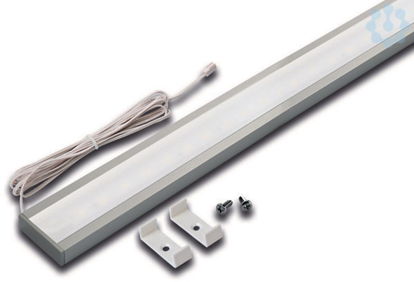 Flache LED-Unterbauleuchte mit homogenem Flächenlicht, Gehäuse Alu, Anschlussleitung 2,5m mit LED 24-Stecker und Leitungsaustritt nach hinten, Lichtfarbe warm weiß ca.3000K, incl. 250mm selbstklebendem weißen Kabelkanal wenn die Leuchte mittig über der Küchen-Arbeitsplatte montiert wird und die Leitung unter dem Hängeschrank nach hinten Richtung Nischenrückwand weggeführt werden muss.