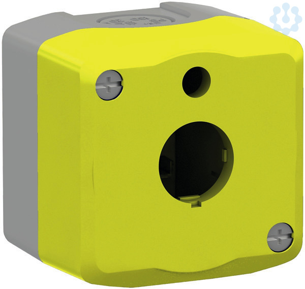 Harmony XALK Baureihe, Leergehäuse mit 1 Stelle. Grundfarbe des Leergehäuses ist gelb. Kompatibel mit beleuchtbarem Not-Aus und beleuchtbarem Schild der Harmony XB5 Baureihe. In Kunststoffausführung. Umgebungstemperatur von -40 bis +70 Grad C. Schutzart bis IP69K, Internationale Standards IEC, UL, CSA, EAC, CE Kennzeichen.