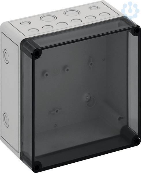 Leergehäuse - Industrie Qualität, Kasten: glasfaserverstärktes Polycarbonat, lichtgrau ähnlich RAL 7035, Deckel: Polycarbonat, transparent, Schutzart IP66, Schlagfestigkeit IK08, Schutzklasse II, Bemessungsisolationsspannung Ui 690VAC/DC, Ui=1000VDC, Halogenfrei, 182 x 180 x 111, mit metrischen Vorprägungen