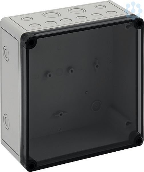 Leergehäuse - Industrie Qualität, Kasten: glasfaserverstärktes Polycarbonat, lichtgrau ähnlich RAL 7035, Deckel: Polycarbonat, transparent, Schutzart IP66, Schlagfestigkeit IK08, Schutzklasse II, Bemessungsisolationsspannung Ui 690VAC/DC, Ui=1000VDC, Halogenfrei, 182 x 180 x 90, mit metrischen Vorprägungen