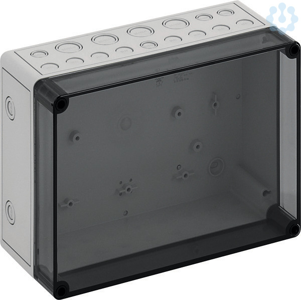 Leergehäuse - Industrie Qualität, Kasten: glasfaserverstärktes Polycarbonat, lichtgrau ähnlich RAL 7035, Deckel: Polycarbonat, transparent, Schutzart IP66, Schlagfestigkeit IK08, Schutzklasse II, Bemessungsisolationsspannung Ui 690VAC/DC, Ui=1000VDC, Halogenfrei, 254 x 180 x 111, mit metrischen Vorprägungen