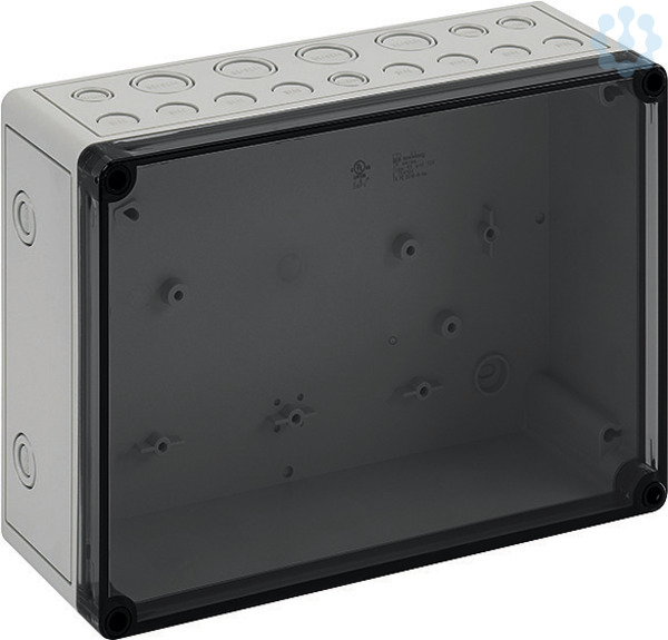 Leergehäuse - Industrie Qualität, Kasten: glasfaserverstärktes Polycarbonat, lichtgrau ähnlich RAL 7035, Deckel: Polycarbonat, transparent, Schutzart IP66, Schlagfestigkeit IK08, Schutzklasse II, Bemessungsisolationsspannung Ui 690VAC/DC, Ui=1000VDC, Halogenfrei, 254 x 180 x 90, mit metrischen Vorprägungen