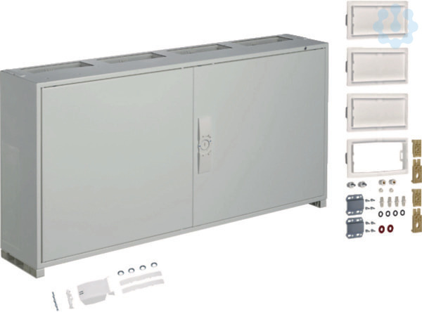 Leerschrank, universZ, 500x1050x205mm, SchutzklasseII, IP44, 144Platzeinheiten. Schrankgehäuse nach DIN VDE 0603/1, Maßnorm DIN 43 870 zur Aufputz, Unterputz oder teilversenkter Montage. Zum Aufbau einer Zählerverteileranlage bis 355 A, Bemessungsspannung 230/400 V 50 Hz. Schutzart IP31 (IP44/IP54 nach DIN VDE 0470/1), Schutzklasse II schutzisoliert, Schutzart IP3X hinter der Tür. Bestehend aus Schrank mit Tür aus pulverbeschichtetem, eingebranntem, stabil profiliertem 1 mm dickem Stahlblech. Innenauskleidung komplett aus Kunststoff. Leitungseinführungen oben und unten durch eingebaute Kunststoffflanschplatten, rückseitige Vorprägung im Kunststoffteil und Sammelschienendurchführungen als beidseitige seitliche Vorprägung im unteren Bereich. Tür frontbündig mit innenliegenden, justierbaren Scharnieren, wahlweise rechts oder links anschlagbar mit 110° Öffnungswinkel. Türverschluss mit Vorreiber, ab Breite 800 mm und bei allen Schränken ab einer Höhe von 1250 mm mit Dreipunktschließung. Türverschluss durch andere