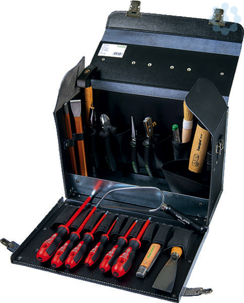 Werkzeugkoffer ?Start?Werkzeugkoffer für den Auszubildenden aus schwarzem Rindsleder, bestückt mit 20 Werkzeugen, Koffer 220060.Inhalt: ? 2K-VDE-Elektriker-Schraubendreher 2,5 x 75, 4 x 100, 5,5 x 125, 6,5 x 150 mm ? 2K-VDE-Kreuzschlitz-Schraubendreher PH, Gr. 1 + 2 ? 2K-Telefonzange 200 mm ? 2K-Kombizange 180 mm ? 2K-Seitenschneider 160 mm ? 2K-Abisolierzange 160 mm ? Kabelmesser, 1-teilig ? PUK-Taschensäge ? 1 Elektriker-Meißel 10 x 250 mm ? Spannungsprüfer - Klinge 50 mm ? 1 Steinmeißel 300 mm ? 1 Schlosserhammer 300 g ? 1 Fäustel 1000 g ? 1 Spachtel 40 mm ? 1 Gipsmulde ? 1 Pinsel