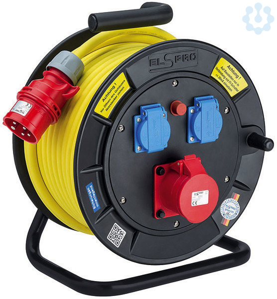 ELSPRO Leitungsroller Baureihe LRX, Eingang: 1,00 Stk. CEE-Stecker 5 pol. / 16 A / 400 V / 6 h, 33,00 m Spezial-Leitung INDUSTRIEFLEX 07HT 5G2,5 mm², Ausgang: 1,00 Stk. CEE-Einbausteckdose 5 pol. / 16 A / 400 V / 6 h, 2,00 Stk. Schutzkontaktsteckdose 3 pol. / 16 A / 230 V, Eigenschaften: - Schutzklasse 2, - Ausführung K2, - Schutzart IP 54, - schutzisoliertes Gehäuse, - thermischer Überhitzungsschutz 1 pol., - allpolige Abschaltung über ein Schütz 3 pol., - robustes und standsicheres Rohrgestell mit hohem Tragekomfort, kunststoffpulverbeschichtet, - mit isoliertem Griff, -