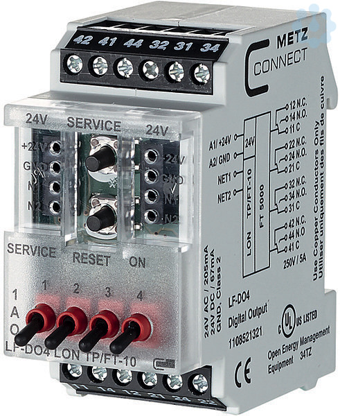 Das LON-Modul mit 4 digitalen Ausgängen wurde für dezentrale Schaltaufgaben entwickelt. Es ist geeignet zum Schalten elektrischer Komponenten, z. B. Motoren, Schütze, Lampen, Jalousien usw. Hierbei sind die Relaiskontakte durch geeignete lastabhängige Maßnahmen zu schützen. Die Ausgänge können durch Netzwerkvariablen SNVT angesteuert werden. Das Modul verfügt über eine Handbedienebene, die nur im Configured Mode aktiviert ist. Zusätzlich ist eine einstellbare Wischerfunktion integriert. Geeignet zur dezentralen Montage in Reihenunterverteiler.Anschluss mit Schraubklemmen