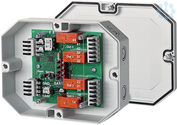 Das LON-Modul im IP65-Gehäuse mit 4 digitalen Ausgängen wurde für dezentrale Schaltaufgaben entwickelt. Es ist geeignet zum Schalten elektrischer Komponenten, z. B. Motoren, Schütze, Lampen, Jalousien usw. Hierbei sind die Relaiskontakte durch geeignete lastabhängige Maßnahmen zu schützen. Die Ausgänge können durch Netzwerkvariablen SNVT angesteuert werden. Das Modul verfügt über eine Handbedienebene, die nur im Configured Mode aktiviert ist. Zusätzlich ist eine einstellbare Wischerfunktion integriert.