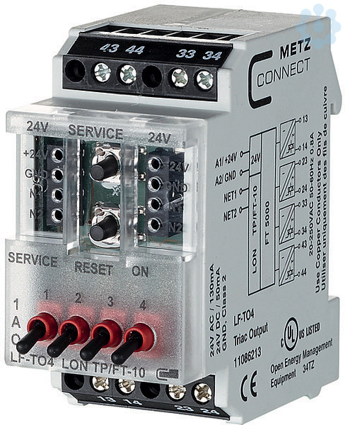 Das LON-Modul mit 4 digitalen Ausgängen wurde für dezentrale Schaltaufgaben entwickelt. Es ist geeignet zum Schalten elektrischer Komponenten, z. B. Relais, Schütze, HLK-Ventile usw. Die 4 TRIACs können in einer LON-Installation per Standard-Netzwerkvariablen einzeln angesteuert werden. Das Modul verfügt über eine Handbedienebene, die nur im Configured Mode aktiviert ist. Zusätzlich ist eine einstellbare Impuls-/Pausenfunktion integriert. Geeignet zur dezentralen Montage auf Tragschiene TH35 nach IEC 60715 in Elektroverteilern.Anschluss mit Schraubklemmen