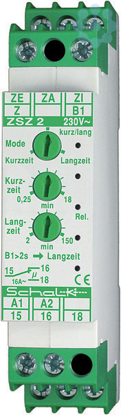 Der ZSK 2 vereint als moderner Lichtzeit-Impulsschalter (Stromstoßschalter) ein hohes Maß an Komfort, Flexibilität und Funktionsvielfalt bei einfacher Handhabung und Bedienung. Durch kurzes bzw. längeres Betätigen des Lichttasters kann zwischen zwei voneinander unabhängig einstellbaren Zeitbereichen ausgewählt werden. Damit wird eine individuell konfigurierbare Kurzzeit- / Langzeitumschaltung in einem Bereich von 0,25 bis 150 Minuten ermöglicht. Durch erneute Betätigung des Lichttasters wird ein sofortiges Abschalten der Verbraucher erreicht. Zwei Betriebsarten ermöglichen ein Sperren der Langzeitumschaltung. Der ZSZ 2 beinhaltet einen zusätzlichen, von den übrigen Ein- und Ausgängen galvanisch getrennten Fremdspannungseingang (8v-230V UC), der z.B. von einer Türsprechanlage ohne Koppelrelais angesteuert werden kann, und des weiteren zwei Eingänge für zentrale Ein- und Ausschaltung., Maße: 18x55mm, 230V AC - 1 Schließer (potenzialfrei) 16A, tvK/tvL -18/-150min