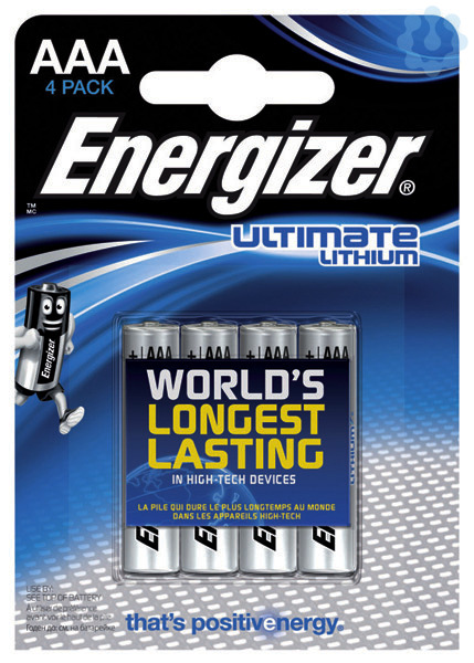 Die weltweit langlebigste und technisch fortschrittlichste AAA Batterie. Super-Premium Lithium Batterie mit der weltweit höchsten Leistung. Die langlebigste Batterie in Hightech-Geräten. Für Anwender, die Wert auf maximale Leistung legen. Ideal für High-Tech-Geräte mit hohem Energiebedarf, wie Digitalkameras, elktronische Messgeräte, Blutdruckmessgeräte, Schnurlosmikrofone, Labelprinter, GPS-Geräte, etc.. Hält bis zu 11x länger in Digitalkameras*. 33% leichter als Standard Alkali-Batterien der Größe AA. Hält extremen Bedingungen von -40 °C und 60 °C stand und zeichnet sich bei allen Outdoor Anwendungen aus. 20 Jahre lagerfähig. *Im Vergleich zu einer Energizer AA- oder AAA-Standardbatterie (Ergebnisse variieren je nach Kamera)