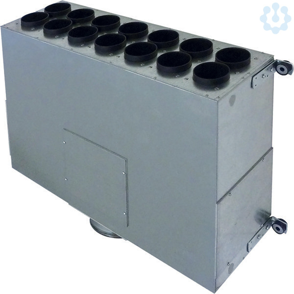 Luftverteiler-Kasten aus Blech mit schallgedämmer Innenauskleidung. Frontblechplatte versehen mit integrierten Kunststoff-Einschubadaptern MF-WE für den passgenauen und schnellen Einschub der Flexrohre MF-F. Bei der Auslieferung sind jeweils die Hälfte der Einschubadapter mit Verschlusskappen versehen. Ausgestattet mit 4 Gummi-Befestigungswinkeln für schallentkoppelte Wand-/ Deckenmontage. 3 demontierbare Revisionsanschlussplatten (2 x seitlich, 1 unten am Verteilerkasten). Stirnseitiger Hauptrohranschluss (NW 125/NW 160) kann versetzt werden auf Revisionsanschlussplatten. Einsatz als Durchgangs-bzw. 90°-Verteiler. Notwendiges Zubehör: Dichtungsringe MF-FDR.Artikel: MF-BV63-160-14, Luftrichtung: Be- oder Entlüftung, Volumenstrom: 280 m3/h / empfohlen, Material: Stahlblech, verzinkt, Gewicht: 11,9 kg, Anschlussdurchmesser: 160 mm, Anschlussdurchmesser Flexrohr: 63 mm, Anzahl Anschlussstutzen: 14, Breite: 650 mm, Höhe: 200 mm, Tiefe: 500 mm