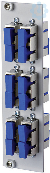 Frontplatte 3HE/7TE mit 6 SC-D Kupplungen, Führungshülse aus Keramik geschlitzt für Singlemode und Multimode Anwendungen, geeignet für den Einbau in OpDAT REGpro und OpDAT REG S, Stahlblech pulverbeschichtet, grau, Varianten: bestückt mit SC-D-Kupplungen jeweils metallisch oder blau (OS2), violett (OM4), aqua (OM3), beige (OM2) oder grün (OS2 APC)