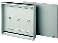 Anmerkungen: Gehäuse mit Klappdeckel, abschließbar, Zugentlastungsleisten im Gehäuse und Dichtungsleisten für ankommende und herausgeführte Kabel, Aufnahme für maximal 24 Spleißkassetten oder 8 Kassetten und 2 Verteilerplatten Abmessungen: 440 x 440 x 85 mm Bezeichnung: LWL-Kombi-Wandbox