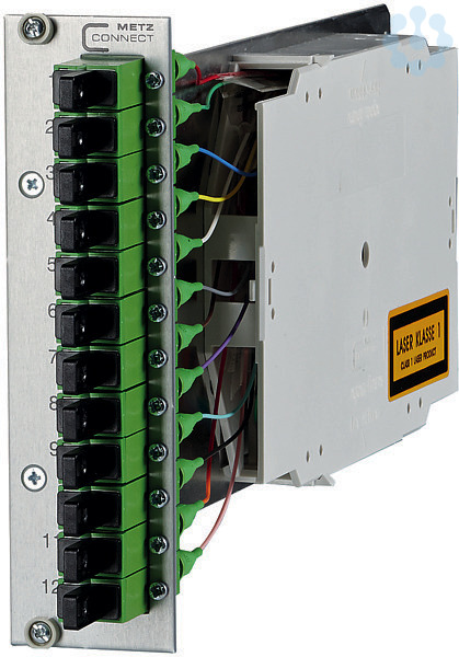 Kompaktmodul OpDAT CM 12xE2000 APC 3HE/TE, komplett bestückt mit 12 E2000 APC-Kupplungen und 12 E2000 APC-Pigtails, Pigtails mit Kompaktader ø 0,9 mm, Länge 2,0 m, 12 Farben, Pigtails in Standardspleißkassette mit Crimpspleißhalter eingelegt und abgesetzt, Pigtails gereinigt und in Kupplungen eingesteckt, Frontplatte aus silber eloxiertem Aluminium, Kupplungspositionen nummeriert, Trägerplatte aus Stahl, bestückt mit Spleißkassette und Überlängenkassette, jeweils mit Deckel, Befestigung im Baugruppenträger mit unverlierbaren Schrauben