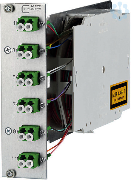 Kompaktmodul OpDAT CM 6xLC-D 3HE/TE, komplett bestückt mit 6 LC-D-Kupplungen und 12 LC-Pigtails, Pigtails mit Kompaktader ø 0,9 mm, Länge 2,0 m, 12 Farben, Pigtails in Standardspleißkassette mit Crimpspleißhalter eingelegt und abgesetzt, Pigtails gereinigt und in Kupplungen eingesteckt, Frontplatte aus silber eloxiertem Aluminium, Kupplungspositionen nummeriert, Trägerplatte aus Stahl, bestückt mit Spleißkassette und Überlängenkassette, jeweils mit Deckel, Befestigung im Baugruppenträger mit unverlierbaren Schrauben, Varianten: bestückt mit LC-D Kupplungen jeweils blau (OS2), grün (OS2 APC), lindgrün (OM5), violett (OM4) oder aqua (OM3)