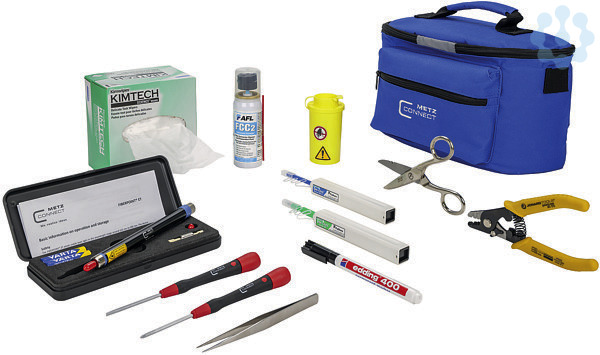 Praktische Tasche mit Hüftgurt und mehreren Innenfächern, Schere zum Schneiden von Aramidgarn (Kevlar), Absetzzange für 3 verschiedene Durchmesser: - zur Entfernung des Kabelmantels (1,6 3 mm -> 0,9 mm), - zur Entfernung des Sekundärcoatings (0,9 mm -> 0,25 mm), - zur Entfernung des Primärcoatings (0,25 mm -> 0,125 mm), Reinigungstücher und Reinigungsflüssigkeit zum einfachen und schnellen Reinigen von Glasfasern nach dem Absetzen, Pinzette zum gefahrlosen Aufnehmen von Glasfaserresten, Behälter zur gefahrlosen Entsorgung von Faserresten, Rotlichtquelle für LWL-Stecker mit 1,25 und 2,5 mm Ferrule zur Fehlerortung und Durchgangsprüfung, Ferrulenreiniger für LWL-Stecker mit 1,25 und 2,5 mm Ferrulen für mehr als 800 Reinigungen, 2 Schraubendreher (Kreuz und Schlitz), alle Bestandteile der Tasche sind auch einzeln erhältlich, Ausserdem bietet die Tasche noch Platz für weiteres Werkzeug