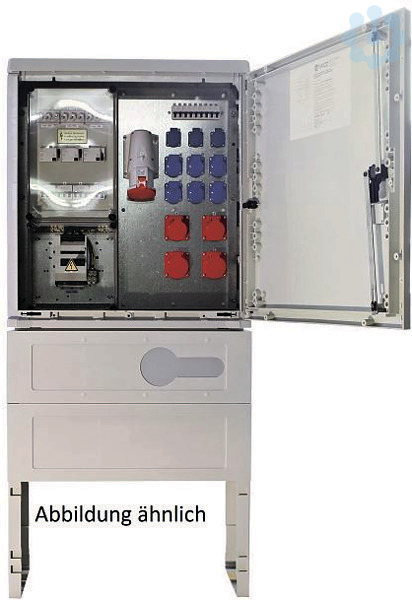 1 Leerplatz für Hausanschlusskasten (BxH = 300x450mm) 3 Haupt-Sicherungsautomaten , 1pol. 63A Eselektiv 1 Zählerplatz 2 FI 4x63/0,03A, 2 CEE 532/6h, 2 CEE 516/6h, 12 Schutzkontakt-Steckdosen.