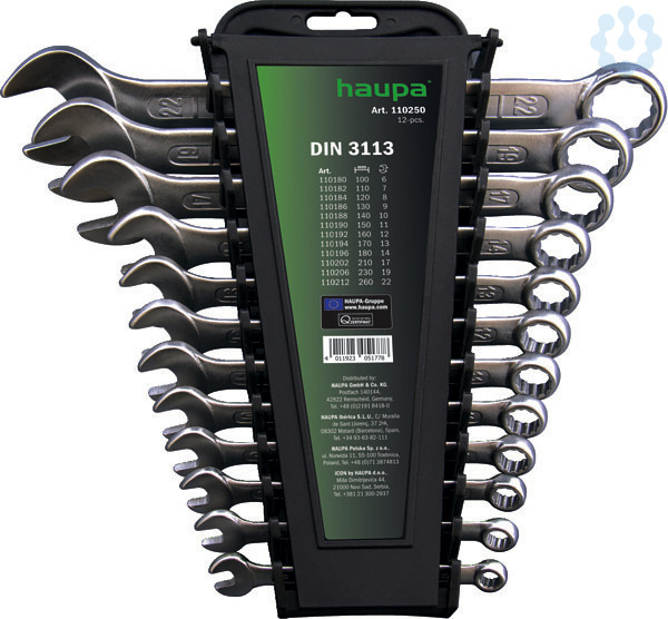 Chrom-Vanadium-Stahl, verchromt, Köpfe geschliffen, Kunststoffhalter inklusive. Inhalt: Art. Nr. 11 02 50: je 1 Stück SW 6 - 7 - 8 - 9 - 10 - 11 - 12 - 13 - 14 - 17 - 19 - 22