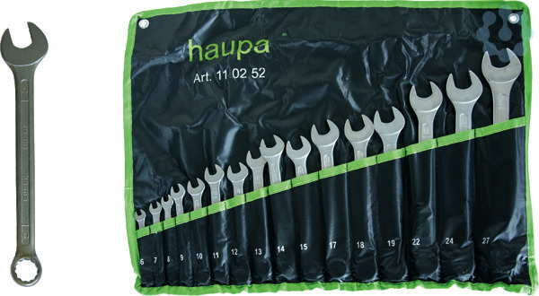 Maulringschlüsselsatz, DIN 3110aus Chrom-Vanadium-Stahl, verchromt, Köpfe geschliffen, in Rolltasche mit Ösen zum Aufhängenaus Chrom-Vanadium-Stahl, verchromt, Köpfe geschliffen, in Rolltasche mit Ösen zum Aufhängen. Inhalt: Art. Nr. 11 02 52: je 1 Stück SW 6 - 7 - 8 - 9 - 10 - 11 - 12 - 13 - 14 - 15 - 17 - 18 - 19 - 22 - 24 - 27