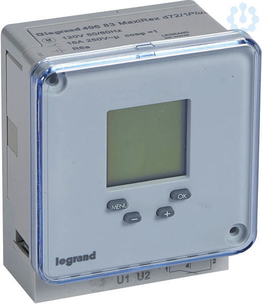 Legrand MaxiRex D72/1 Plus, digitale Wochenzeitschaltuhr für Fronttafeleinbau und Wandmontage, 1 Kanal, 28 Schaltprogramme, Betriebsspannung 120 V 50/60 Hz, Programmerstellung direkt am Gerät. Dauer EIN/AUS,, automatische Sommer-/Winterzeitumstellung, 6 Jahre Gangreserve, Ganggenauigkeit +/- 1 Sek/Tag, Kürzeste Schaltzeit: 1 Min., Fronttafeleinbau Abmessung: 72 x 72 mm. Schaltausgang: 1 Wechsler.
