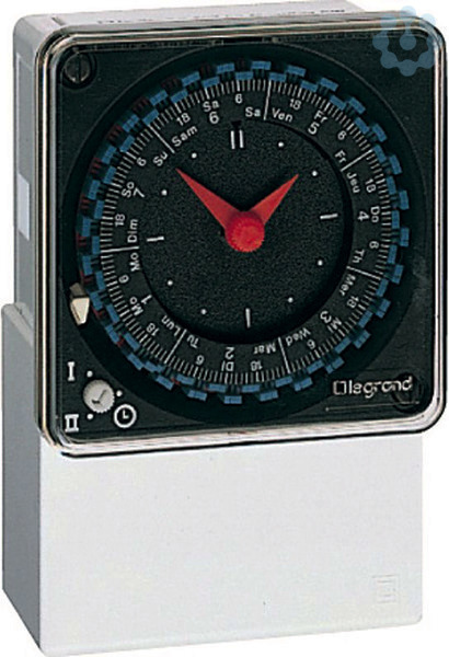 Legrand MicroRex T, analoge Tageszeitschaltuhr mit Synchronmotor (netzsynchrone Ganggenauigkeit) für Fronttafeleinbau und Wandmontage, 1 Kanal, Betriebsspannung 230 V 50 Hz. Mit Handschalter (EIN/AUS/AUTOMATIK). Zeiger vorwärts und rückwärts drehbar, dadurch leichte Umstellung (z.B. Sommer-/Winterzeit), kürzeste Schaltzeit 30 Min.. Schaltausgang: 1 Wechsler.
