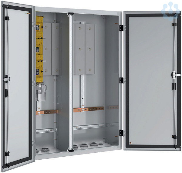 Komplettschrank für Mehrfach-Netzanschluss bis 400 A bestehend aus: 1x Trennleiste NH2, Sammelschienensystem 185 mm 4-polig, Doppeltür mit 2 separaten Schließungen, Schutzart IP54, gem. Vorgabe Stadtwerke München, mögliche Bestückung: netzseitig 2x NH2 und abgangsseitig 3x NH2 oder 6x NH00