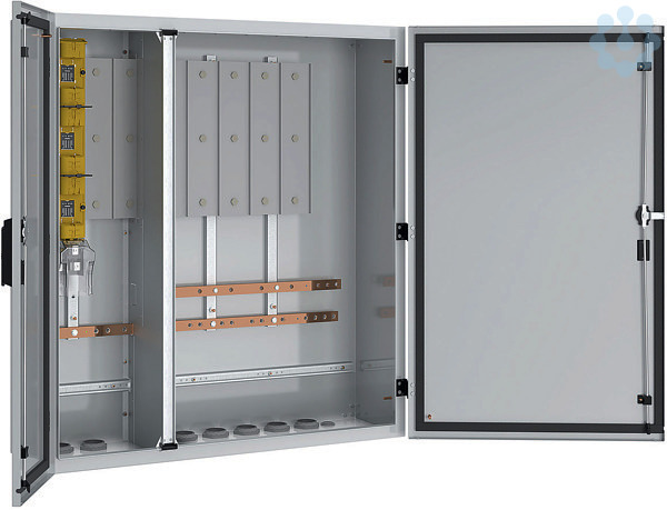 Komplettschrank für Mehrfach-Netzanschluss bis 400 A bestehend aus: 1x Trennleiste NH2, Sammelschienensystem 185 mm 5-polig, Doppeltür mit 2 separaten Schließungen, Schutzart IP54, gem. Vorgabe Stadtwerke München, mögliche Bestückung: netzseitig 2x NH2 und abgangsseitig 5x NH2 oder 10x NH00