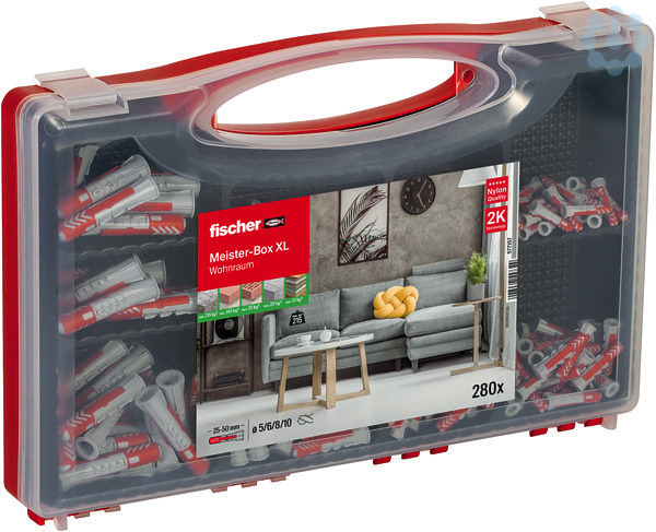 Diese fischer Meister-Box bietet eine praktische und übersichtliche Aufbewahrungslösung als Dübelset für Werkstatt und Baustelle. Der hochwertige, schlagfeste Kunststoffbehälter mit transparentem Deckel ermöglicht jederzeit einen klaren Blick auf den Inhalt. Die vorsortierte 280-teilige Box enthält 30 x DuoPower 5 x 25, 140 x DuoPower 6 x 30, 80 x DuoPower 8 x 40 und 30 x DuoPower 10 x 50 ? optimal für die Befestigung im Wohnraum.Der DuoPower ist ein intelligenter 2-Komponenten-Dübel, der sich automatisch den Gegebenheiten des Baustoffs anpasst. Dank seiner kompakten Bauform reduziert der DuoPower den Bohraufwand, während der schmale Dübelrand das Durchrutschen in das Bohrloch verhindert. Die integrierte Mitdrehsicherung sorgt dafür, dass der Dübel sicher fixiert bleibt und die bestmögliche Rückmeldung gibt einem sofort das Gefühl, wenn der Dübel optimal sitzt. Der DuoPower eignet sich optimal zur Befestigung von leichten und schweren Gegenständen wie Bildern, Lampen, Konsolen, Spiegeln, Wandregalen, Bad- und