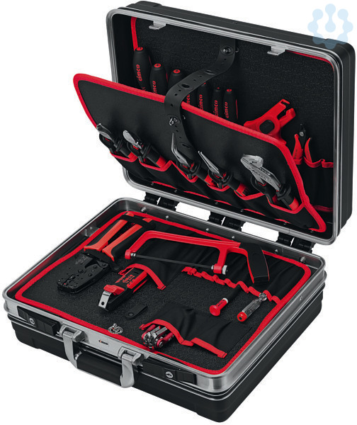 Profi-Hartschalenkoffer aus schlagfestem 3 mm-starkem ABS-Kunststoff mit Aluminiumrahmen, 3 Werkzeugtafeln mit vielen Einsteckfächern, separate Dokumentenaufbewahrung, Bodenschale mit individuell verstellbaren Facheinteilern für Kleinteile, Messgeräte, Werkzeug etc. , 2 abschließbare Schlösser, komplett mit 21 Werkzeugen. Werkzeugkoffer-Bestückung: 1 x Telefonzange, gerade (10 0216), 1 x Telefonzange, gebogen (10 0238), 1 x Seitenschneider 160 mm (10 0574), 1 x Abisolierzange Super 4 (10 0760), 1 x Elektronik-Seitenschneider (10 1040), 1 x Wasserpumpenzange (10 1224), 1 x Presszangensystem clickncrimp Elektrotechnik (10 6000), 1 x Stiftschlüssel-Satz (11 0596), 1 x Phasenprüfer (11 1280), 1 x Präzisions-Schlitz-Schraubendreher (11 1864), 1 x Schlitz-Schraubendreher mit 1000 V-Schutzisolation 3,0 x 0,5 (11 7702), 1 x Schlitz-Schraubendreher mit 1000 V-Schutzisolation 4,0 x 0,8 (11 7704), 1 x Schlitz-Schraubendreher mit 1000 V-Schutzisolation 5,5 x 1,0 (11 7705), 1 x Kreuzschlitz-Schraubendreher mit 1000 V-Schu