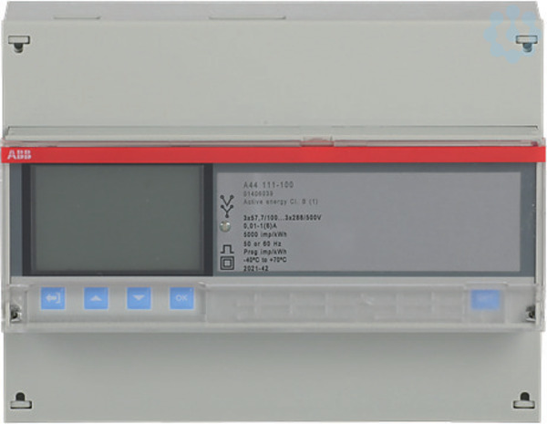 Drehstromzähler zur Messung eines Dreileiter- oder Vierleiter-Drehstromnetzes über einen Wandler-Anschluss CTVT (Wandlerverhältnis für Strom und Spannung konfigurierbar) bis maximal 6 A. Folgende Werte werden über ein weiß hinterleuchtetes Display mit bis zu 7 Stellen ausgegeben: Wirkenergie (Klasse 1), Leistungen, Ströme, Spannungen (L-L, L-N), Frequenz, und Power Faktor, sowohl je Phase als auch gesamt. Die Kommunikation kann über die Infrarotschnittstelle zur Anbindung eines KNX-Moduls erfolgen. Der Energiezähler hat einen Ausgang. Dieser kann wahlweise als Impulsausgang zur Ausgabe der Wirkenergie oder als Alarmausgang verwendet werden. Hier können bis zu 25 Alarmwerte (Schwellwerte mit Zeitverzögerung) eingestellt werden. Zähler ist geeicht nach MID und zugelassen gemäß IEC. Die Einbaubreite beträgt 7 DIN-Module.