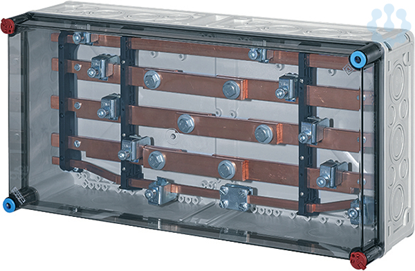 Gehäuse für den Bau von Energie-Schaltgerätekombinationen bis 630 A oder als Einzelgehäuse. Aus hochwertigem Polycarbonat schutzisoliert. Wanddurchführungen mit großen Öffnungen für die elektrische Verbindung der Gehäuse untereinander. Kabeleinführung an allen Gehäusewänden über metrische Vorprägungen oder Anbauflansche. Gehäuse zur Wandbefestigung auch über Außenlaschen oder mit Montageschienen. Gehäuse für den Einbau von 3 Aufsteckstromwandlern (separat bestellen). Für interne Messung bis 400 A, horizontale Ausrichtung. Kombination mit Sammelschienensystem 250 A und 400 A möglich. Spannungsabgriff mittels Schraubanschluss M5. Deckelverschlüsse für Werkzeugbetätigung, plombierbar.