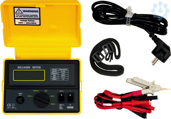 Dieses Milliohmmeter im spritzwassergeschützten Gehäuse ermöglicht Widerstandsmessungen von 100 ?? bis 2000 ?. Die Messwertanzeige am Milliohmmeter erfolgt über eine 3½-stellige, sehr gut ablesbare, LCD-Anzeige. Zur Ermittlung des Messwertes wird ein konstanter Strom ans Messobjekt angelegt und der Spannungsabfall über dem Messobjekt gemessen. Mit dem Milliohmmeter wird ermöglicht Widerstandsmessungen an Spulen, Generatoren, Transformatoren, Schaltkreisen z. B. von Parallel- und Nebenschaltkreisen und von Schaltern und Relais durchzuführen. Ebenfalls misst das Milliohmmeter Bindungsenergie in Minen, Flugzeugen, Gleißsystemen, Schiffen und an elektrischen Installationen in Haushalt und Industrie. Durchgangsprüfungen an Ringsystemen (Ringbus) in Haushalt u. Industrie sind für das Milliohmmeter kein Problem. Dadurch ist es möglich z.B. Kompressionselemente von Oberleitungen zu testen oder Test- u. Wartungsarbeiten an Schaltschränken durchzuführen. Ebenso können mit dem Milliohmmeter Bauteilen wie Sicherungen, Ve
