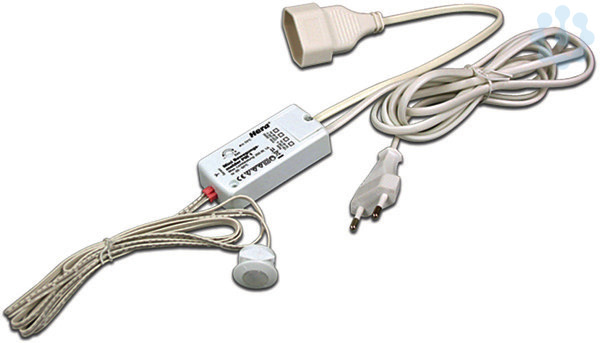 Mini Bewegungsmelder zum Anschluss von Leuchten-Betriebsgeräten der Schutzklasse II, Anschlussleitung 2m mit Eurostecker, Schaltleitung 0,3m mit Eurokupplung, Sensorleitung 1,4m, Einbau des Sensors für 20mm Bohrung, Nachlaufzeit von 10 Sekunden bis 3 Minuten einstellbar, Erfassungswinkel 80°, Erfassungsbereich 2,5m bei Montagehöhe von 1-2m