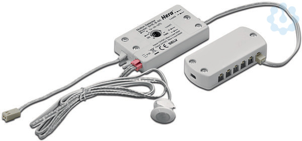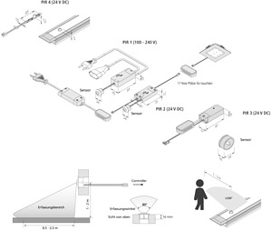 Mini Bewegungsmelder zum Anschluss von LED 24V Leuchten, Anschlussleitung 0,2m mit LED 24-Stecker, Schaltleitung 0,2m mit 11-fach Verteiler, Sensorleitung 1,4m, Einbau des Sensors für 20mm Bohrung, Nachlaufzeit von 10 Sekunden bis 3 Minuten einstellbar, Erfassungswinkel 80°, Erfassungsbereich 2,5m bei Montagehöhe von 1-2m