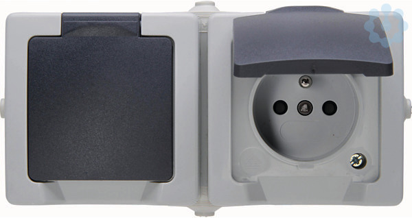 Aufputz-Feuchtraum 2-fach Mittenschutzkontakt-Steckdose im Design NAUTIC und der Farbe grau mit erhöhtem Berührungsschutz in waagrechter Ausführung. Nennspannung beträgt 250V~ und Nennstrom 16A. Schutzart IP 44.