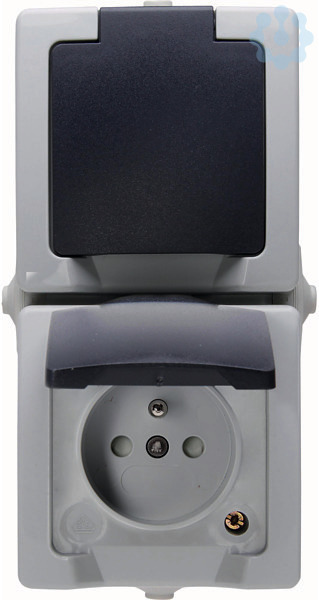 Aufputz-Feuchtraum 2-fach Mittenschutzkontakt-Steckdose im Design NAUTIC und der Farbe grau mit erhöhtem Berührungsschutz in senkrechter Ausführung. Nennspannung beträgt 250V~ und Nennstrom 16A. Schutzart IP 44.