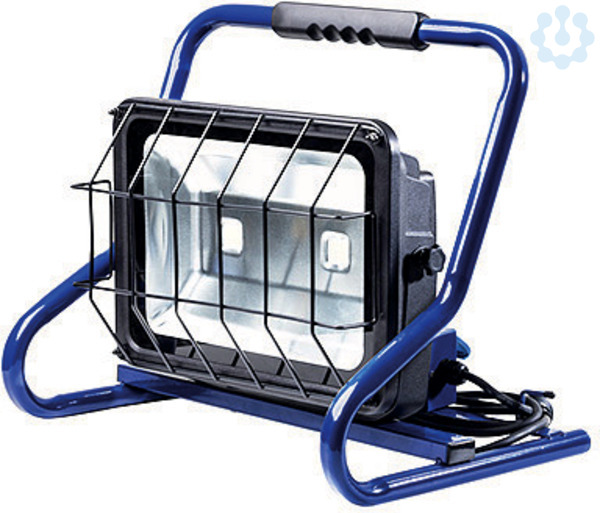 mobiler Strahler mit LED Chip, schmale Bauform mit zwei Schutzkontaktsteckdosen mit Klappdeckel, blaues Gestell und schwarzes Schutzgitter, 3 m Gummischlauchleitung H07RN-F 3G1,5 mit Schutzkontaktstecker